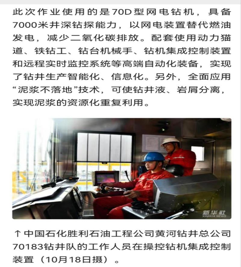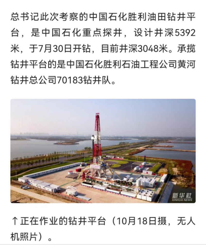 2021年11月投入运行的生产指挥中心,以井筒业务一体服务平台为依托,通过生产、技术、安全三部门联动值班,充分发挥了一体化运行优势,提升了业务整体协同效能。该系统串联两级生产指挥中心,实时掌握公司生产进度、现场工况,实现了对重点井、复杂井远程监控和决策支持等功能,在应急事件快速定位、事件类型自动分析、生产信息一键推送、处置过程跟踪记录等方面发挥了重要作用,显著提高了公司应急处置能力和效率。2022年10月21日,习近平总书记继续在山东省东营市考察调研。他来到胜利油田勘探开发研究院和钻井平台,了解胜利油田创新发展等情况。习近平指出,石油能源建设对我们国家意义重大,中国作为制造业大国,要发展实体经济,能源的饭碗必须端在自己手里(下面两张图片来自新华社)。